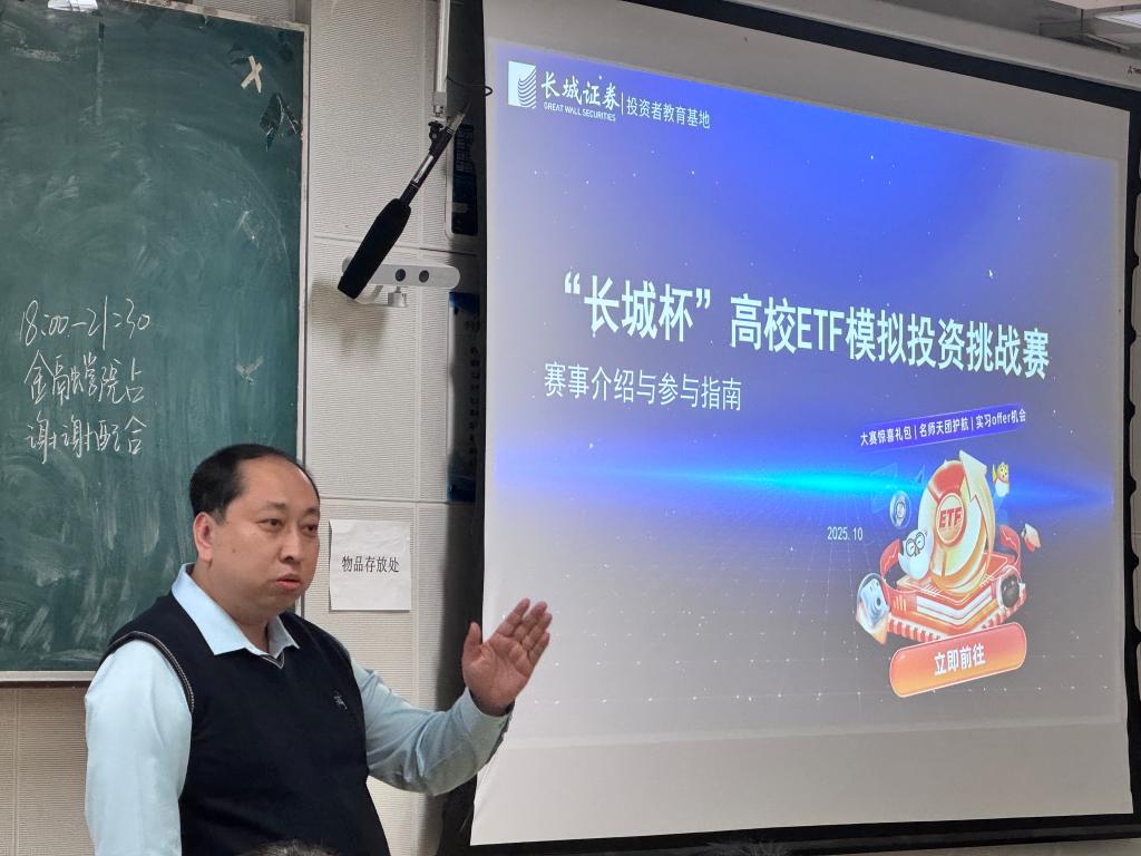 活动现场,袁翌首先对长城证券投资者教育基地的建设情况与功能定位进行了介绍,随后围绕ETF比赛的背景意义、赛程安排、参赛规则及预期收获展开详细解读,并对第二届ETF大赛的报名流程进行了说明。为强化学生风险防范意识,活动期间特别设置安全教育环节,通过典型案例剖析与风险点提示,引导同学们树立理性投资观念,筑牢安全防线。