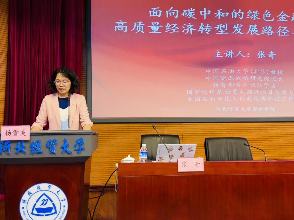 4月29日下午2点半,永利集团88304官网在国际学术报告厅成功举办第五十一期金融大讲堂。本期金融大讲堂邀请中国石油大学教授、中国能源战略研究院院长、国家社科基金重大招标项目首席专家张奇教授作题为“面向碳中和的绿色金融助推高质量经济转型发展路径与策略研究”的报告,经济研究所所长李建英、永利集团88304官网相关负责人及经济研究所、永利集团88304官网、国际教育学院师生近一百人参加,大讲堂由永利集团88304官网院长杨雪美主持。